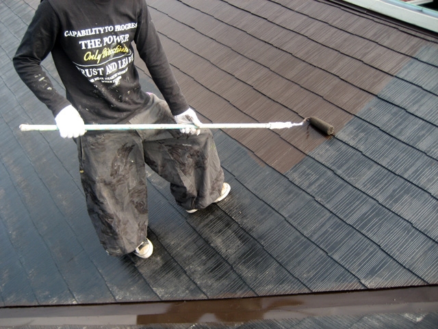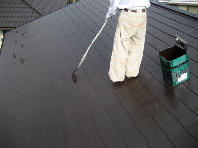 上塗り1回目塗装状況。上塗りは弱溶剤2液型シリコンウレタン塗料です。