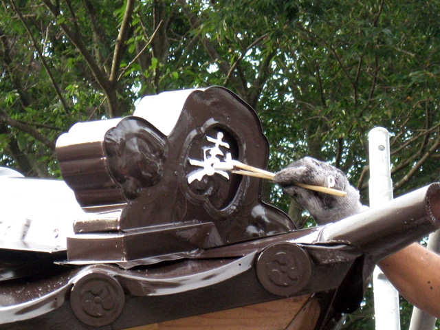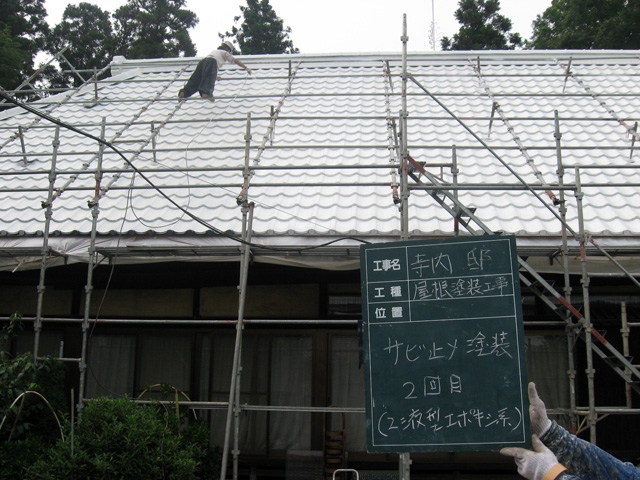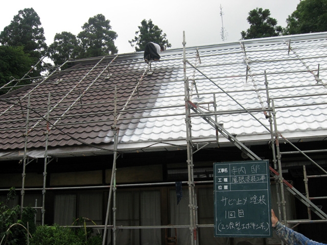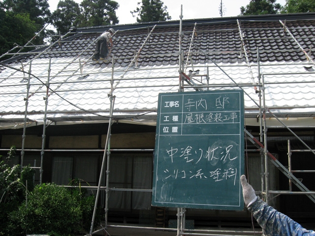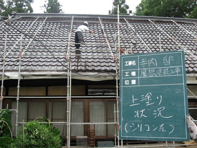 上塗り1回目塗装状況。上塗りは弱溶剤2液型シリコン樹脂塗料です。