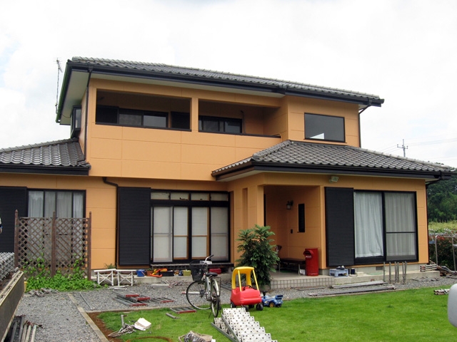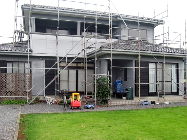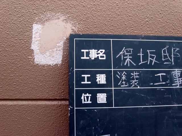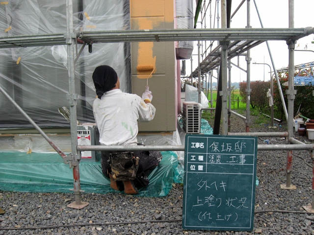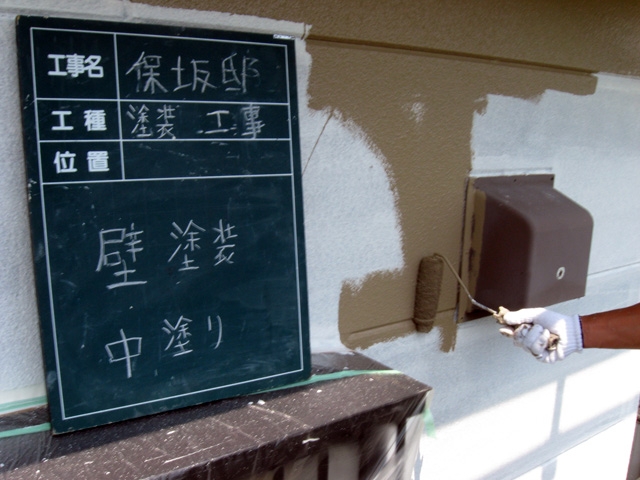 外壁中塗状況。塗料は弱溶剤2液型シリコン樹脂塗料です。