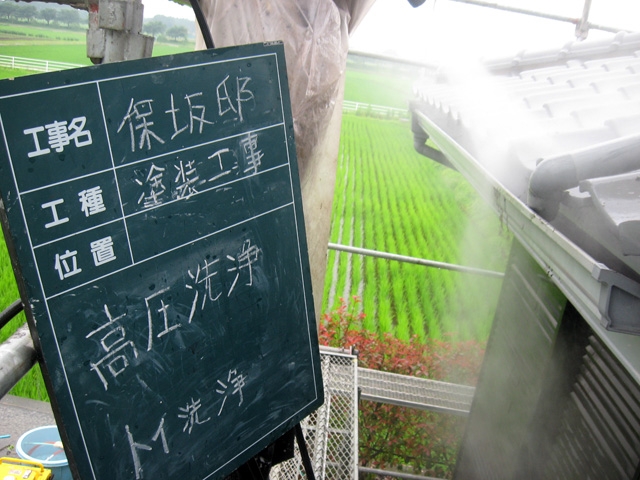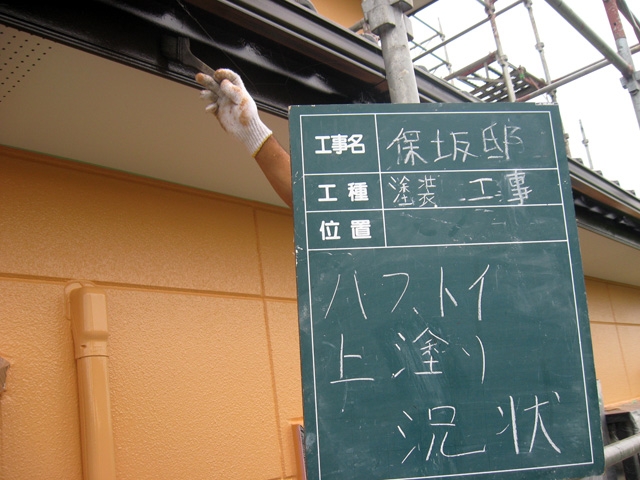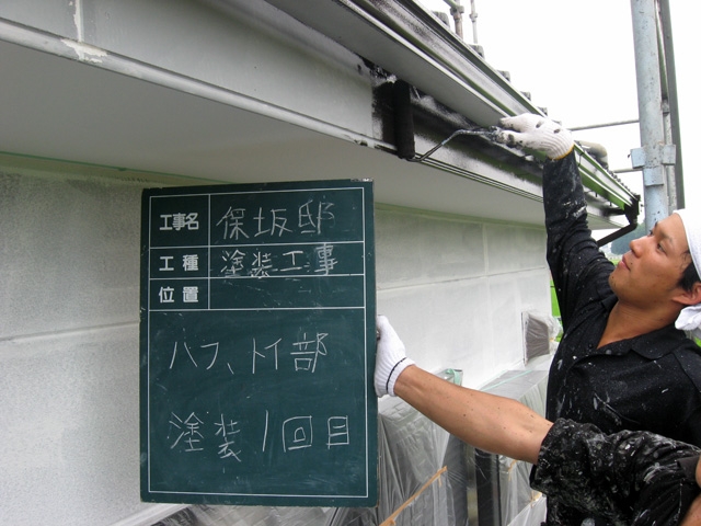 破風・横樋1回目塗装。弱溶剤2液型シリコン樹脂塗料です。