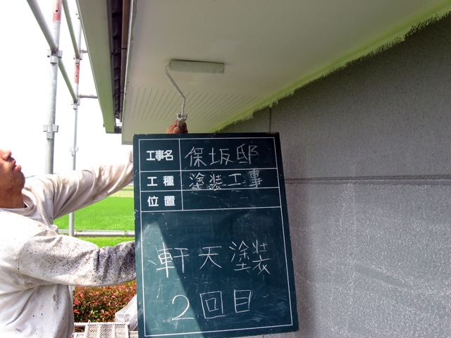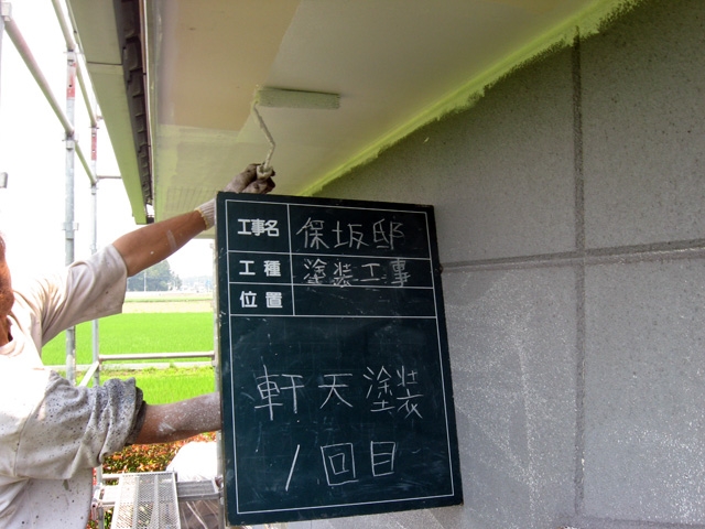 軒天1回目塗装状況。塗料は、防カビに優れている非水系塗料です。