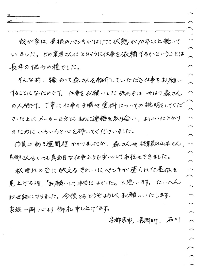 丁寧に仕事の手順や塗料についての説明をして下さった上に、よりよい仕上がりのためにいろいろと心を砕いてくださいました。
